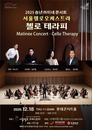 [메디컬프라임 주형준 기자] 한국조혈모세포은행협회(회장 이홍기, 이하 KMDP)가 서울첼로오케스트라(단장 김현)와 함께 12월 18일 오전 11시 30분에 롯데콘서트홀에서 열리는 2025 송년 마티네콘서트 ‘첼로 테라피’ 공연에 조혈모세포 기증자를 초청한다.서울시 지정 전문예술단체인 서울첼로오케스트라는 첼로로만 구성된 예술단체로서 그간 한마음혈액원과 함께 헌혈자 초청 자리를 마련해 왔다. 올해는 한마음혈액원 헌혈카페를 통해 조혈모세포 기증 등록 후 실제 기증으로 이어진 분들도 함께 초청해 아름다운 클래식 선율을 통해 생명나눔 문화
