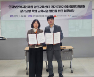 [메디컬프라임 윤성종 기자] 한국보건복지인재원 경인교육센터(센터장 이수경, 이하 경인교육센터)가 경기도 사회서비스원 산하 경기도장기요양요원지원센터(센터장 이승훈, 이하 지원센터)와 장기요양요원의 직무 역량강화와 교육품질 향상을 위한 업무협약(MOU)을 체결했다.이번 협약은‘노인장기요양법’시행 규칙에 따라 요양보호사 및 교육강사의 보수교육이 의무화 되는 등 장기요양 인재 양성의 중요성이 커짐에 따라, 양 기관이 보유한 인적·물적 자원을 교류하고 체계적인 교육 협력망을 구축하기 위해 마련되었다. 양 기간은 이번 협약을 통해 ▲요양보호사