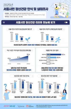 [메디컬프라임 백현석 기자] 서울시정신건강복지센터(이하 서울센터)의 ‘2025년 서울시민 정신건강 인식 및 실태조사’ 결과, 서울시민 10명 중 7명(72.1%)이 지난 1년간 1개 이상의 정신건강 어려움을 경험한 것으로 나타났다.해당 조사는 서울시민의 정신건강 문제에 대한 인식 수준과 관련 서비스 이용 현황을 모니터링하기 위해 2007년부터 격년으로 시행되고 있으며, 2025년에는 정신건강 문제의 실태를 보다 심층적으로 파악하기 위한 조사가 함께 진행됐다. 조사 결과, 시민 다수가 정신적 부담을 체감하고 있어 서울시민의 정신건강에