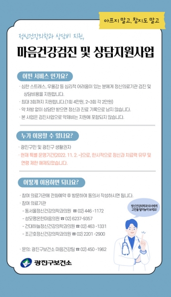 [메디컬프라임 윤준혁 기자] 광진구가 우울감 등 심리적인 어려움을 겪는 구민에게 정신건강 상담비를 지원한다.