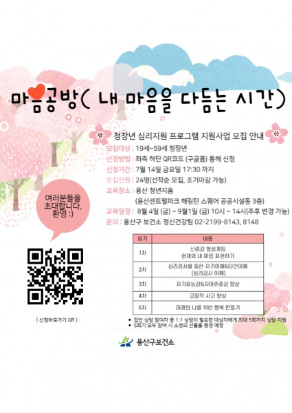 [메디컬프라임 주형준 기자] 서울 용산구는 30일부터 관내 직장인과 대학생을 위한 청·장년 심리지원 프로그램 ‘마음공방’을 시범 운영한다.
