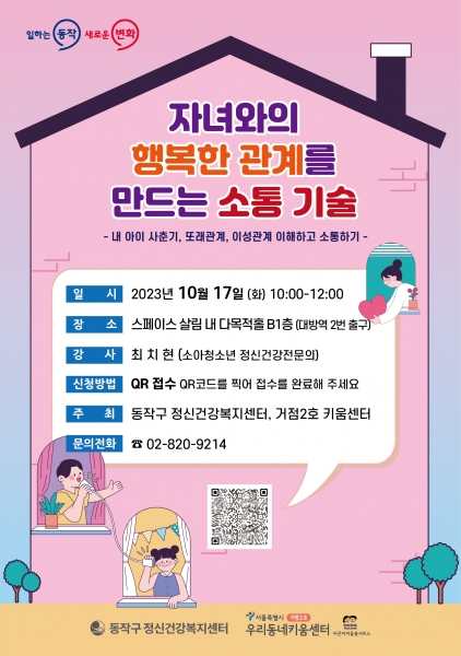 10월 17일 오전 10시 스페이스 살림에서 소아·청소년 정신건강의학과 전문의를 초청해 ‘자녀와의 행복한 관계를 위한 소통 기술’라는 주제로 강의가 열린다.