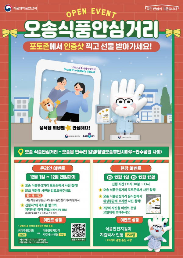 한편, 식약처는 ‘오송 식품안심거리’ 지정을 기념하기 위해 식중독 예방 캐릭터인 지킬박사와 포토존 조형물을 설치했으며 포토존 방문 인증샷을 개인 누리소통망에 게시하면 추첨으로 선정해 소정의 선물을 증정하는 이벤트를 12월 25일까지 진행할 예정이다.