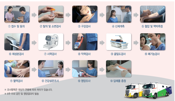 국민건강영양조사는 「국민건강증진법」 제16조에 따라 매년 전국 192개 지역에서 선정된 4,800가구의 1세 이상 가구원 약 1만 명을 대상으로 이동검진차량 내에서 건강 및 영양상태에 대한 약 400개 항목을 조사한다.