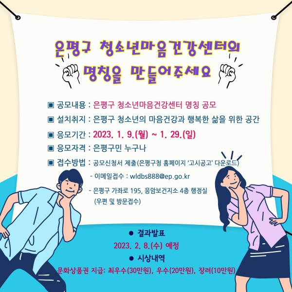 [메디컬프라임 백현우 기자] 서울 은평구가 오는 3월 개소 예정인 ‘청소년마음건강센터’에 어울리는 명칭을 29일까지 명칭 공모한다.