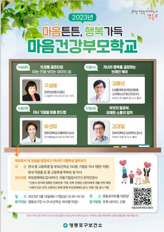 [메디컬프라임 주형준 기자] 영등포구가 3월 14일부터 17일까지 영등포아트홀에서 ‘제3회 마음건강부모학교’를 총 4회 운영한다.
