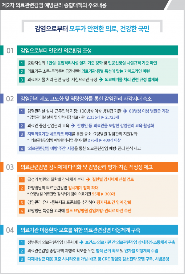 질병관리청은 ‘감염으로부터 모두가 안전한 의료, 건강한 국민’을 제2차 종합대책의 비전으로 제시했으며 의료기관 내 감염확산 최소화를 위한 4개 추진전략 및 12개 중점과제를 선정해 의료관련감염 관리 정책을 강화할 계획이라고 전했다.
